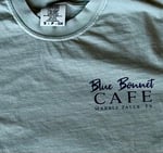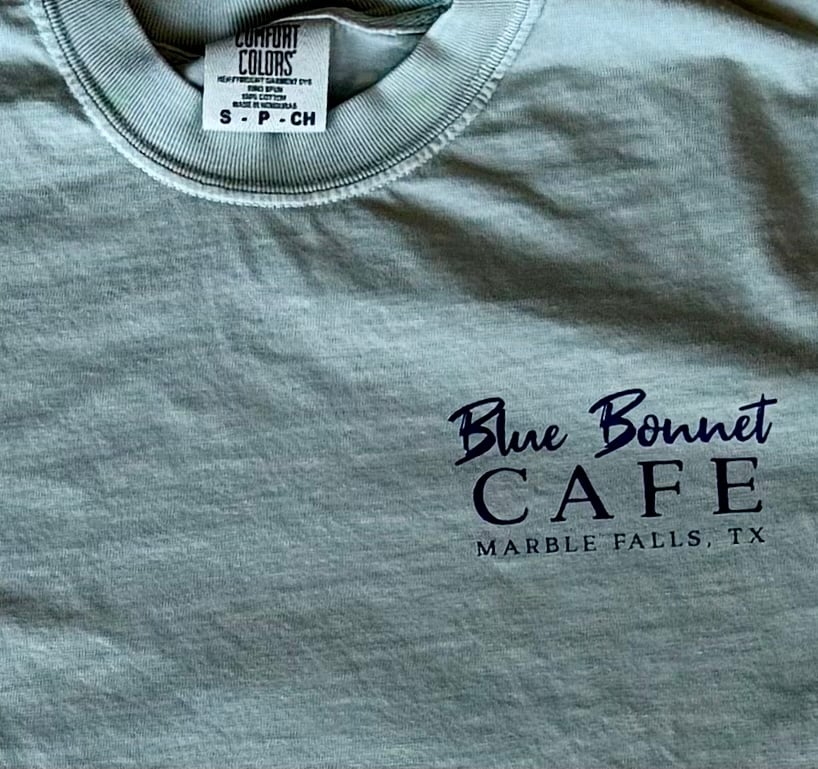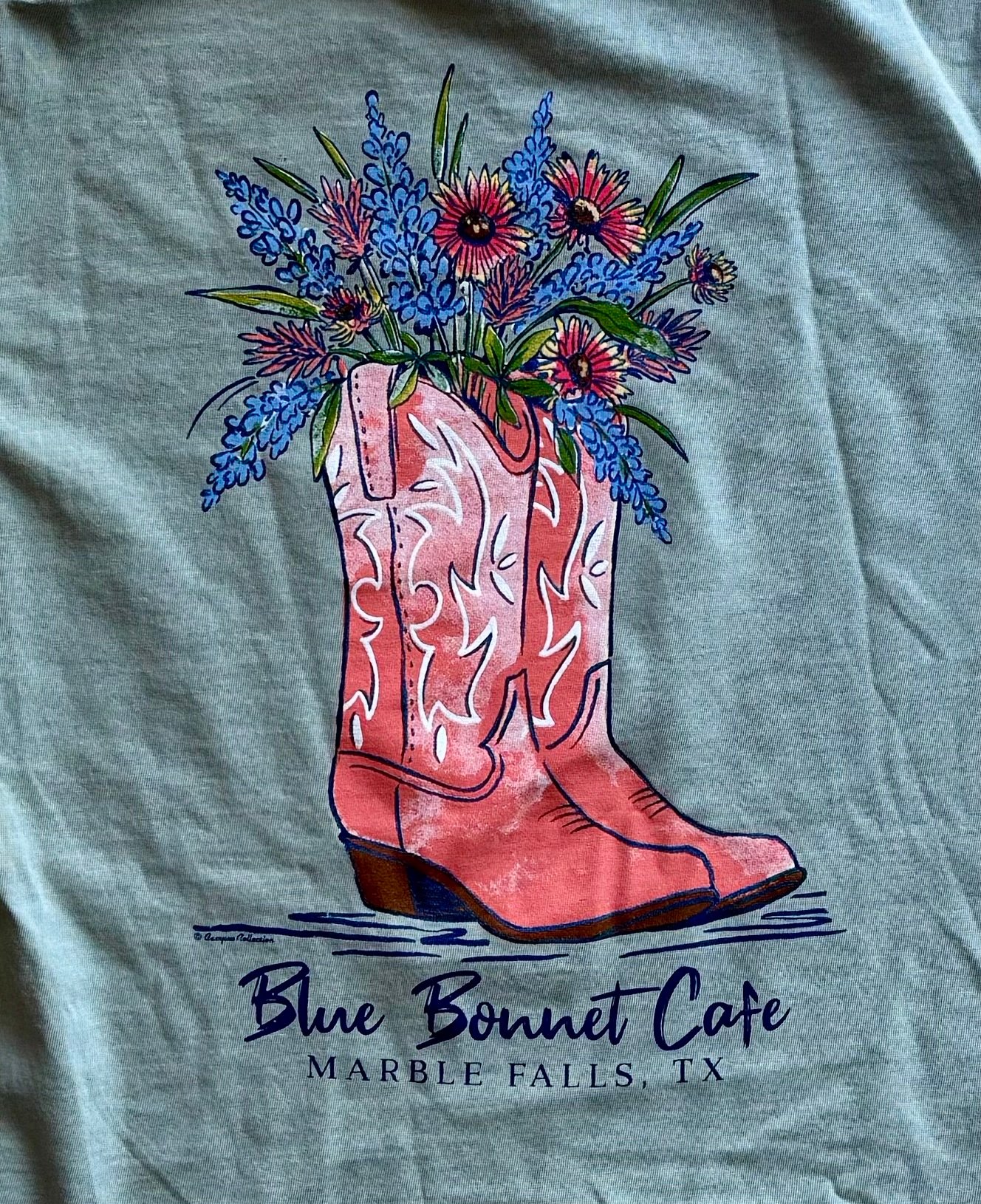 Available in Bay this Comfort Colors t-shirt has illustrations of pink cowboy boots filled with Texas wildflowers and the words, "Blue Bonnet Cafe," and "Marble Falls, TX." The front has the words, "Blue Bonnet Cafe," and "Marble Falls, TX." on left-hand side.