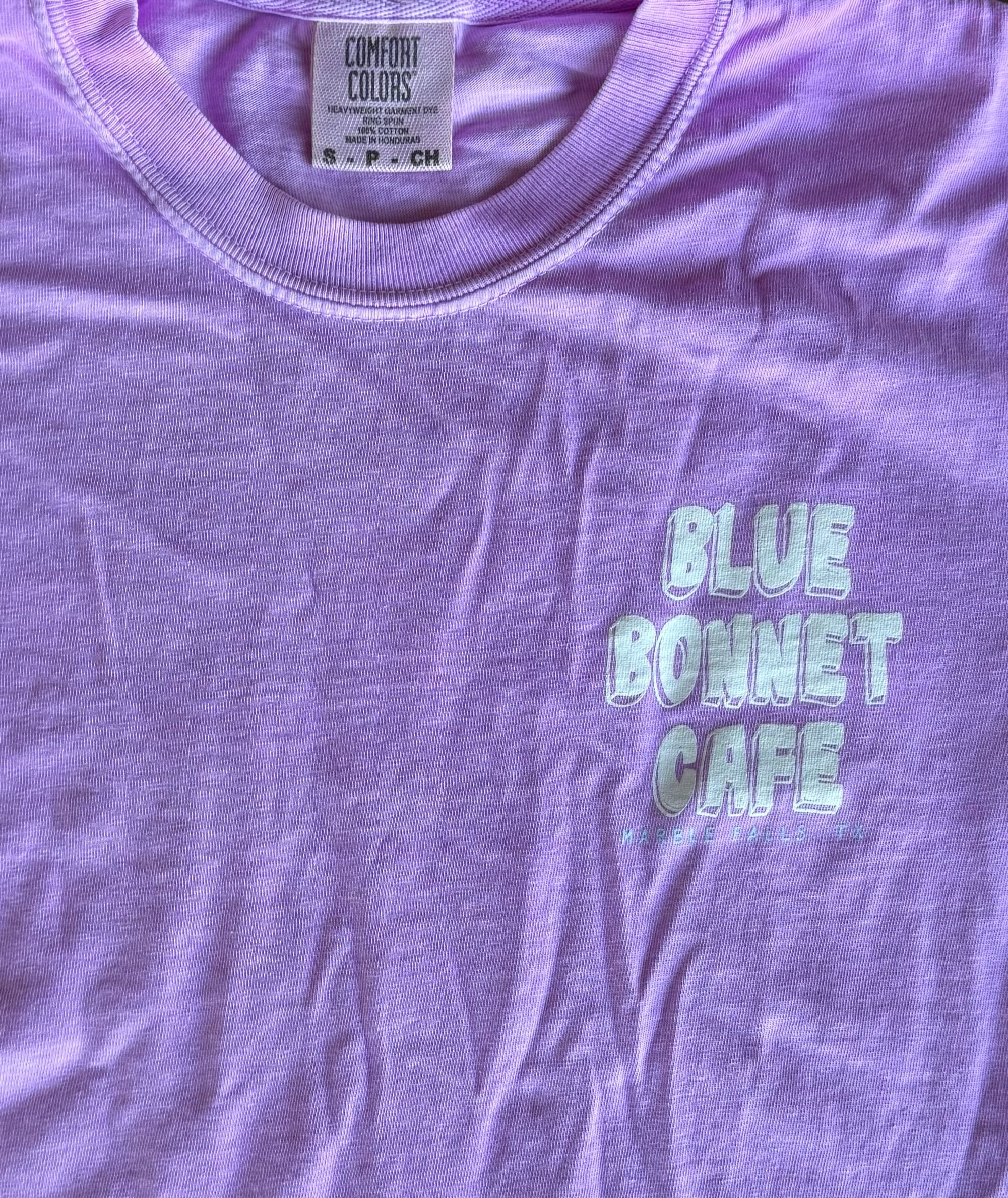 Available in Neon Violet this Comfort Colors t-shirt has illustrations of the Blue Bonnet Cafe coffee mug, lemon meringue pie, and overeasy eggs with bacon with words, "Blue Bonnet Cafe," and "Marble Falls, TX." The front has the words, "Blue Bonnet Cafe" on left-hand side.