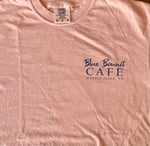 Available in Peach this Comfort Colors t-shirt has illustrations of pink cowboy boots filled with Texas wildflowers and the words, "Blue Bonnet Cafe," and "Marble Falls, TX." The front has the words, "Blue Bonnet Cafe," and "Marble Falls, TX." on left-hand side.
