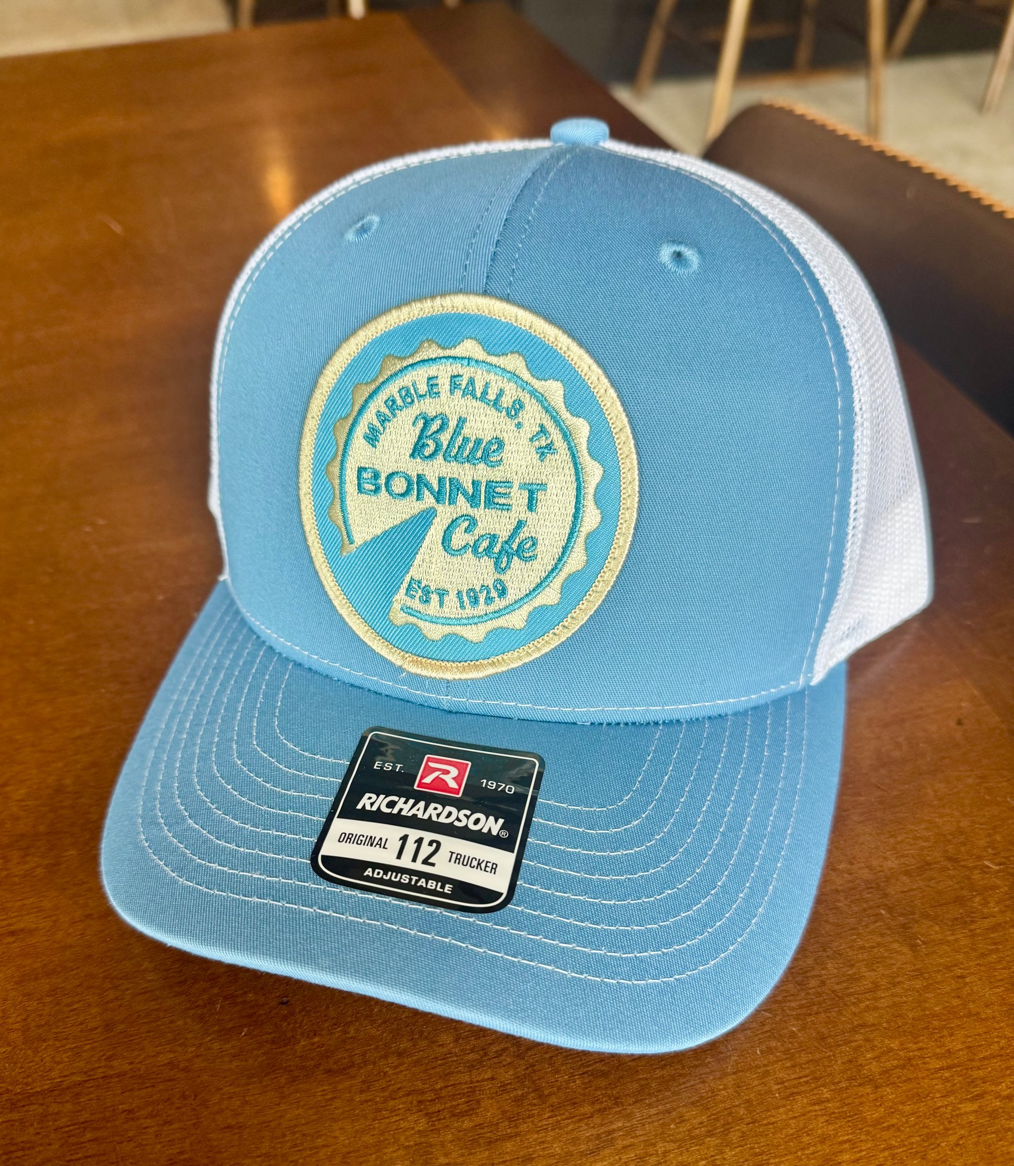 Carolina Blue adjustable trucker hat with a white mesh back and stitching. An embroidered circle patch with the words "Blue Bonnet Cafe," "Est. 1929," and "Marble Falls, TX," are sewn on the front panel with an illustration of a slice taken out of a whole pie.