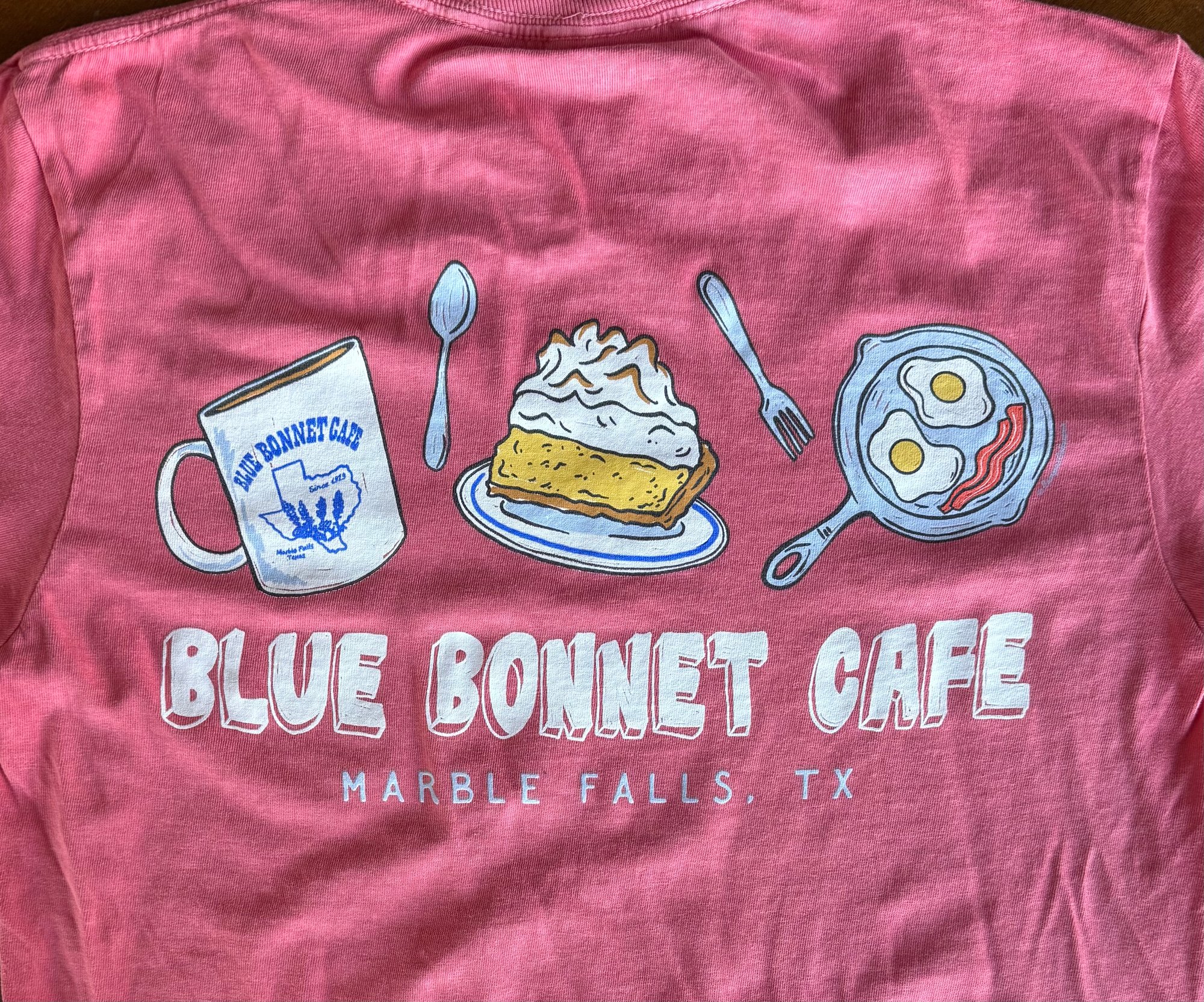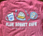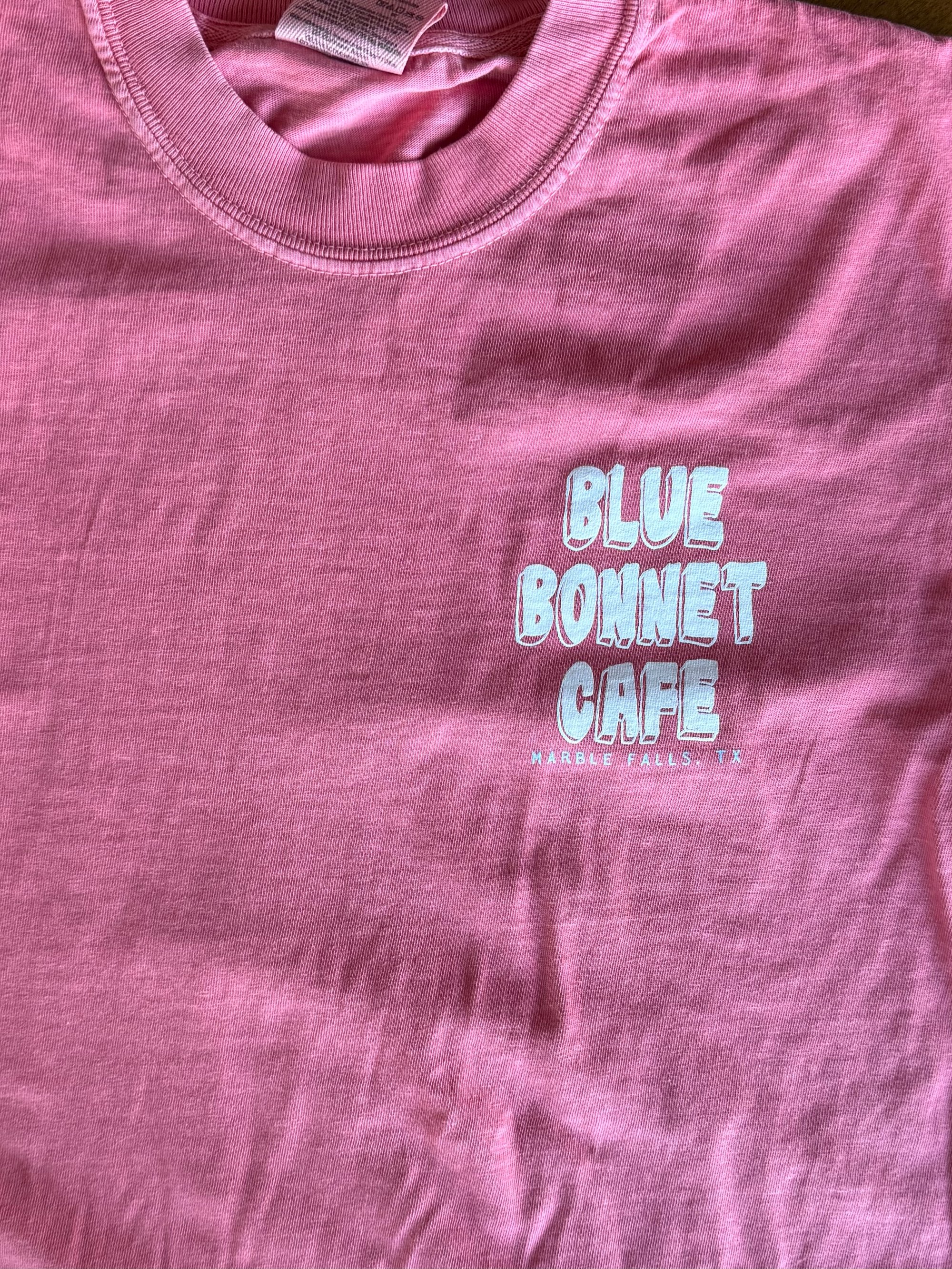 Available in Watermelon this Comfort Colors t-shirt has illustrations of the Blue Bonnet Cafe coffee mug, lemon meringue pie, and overeasy eggs with bacon with words, "Blue Bonnet Cafe," and "Marble Falls, TX." The front has the words, "Blue Bonnet Cafe" on left-hand side.